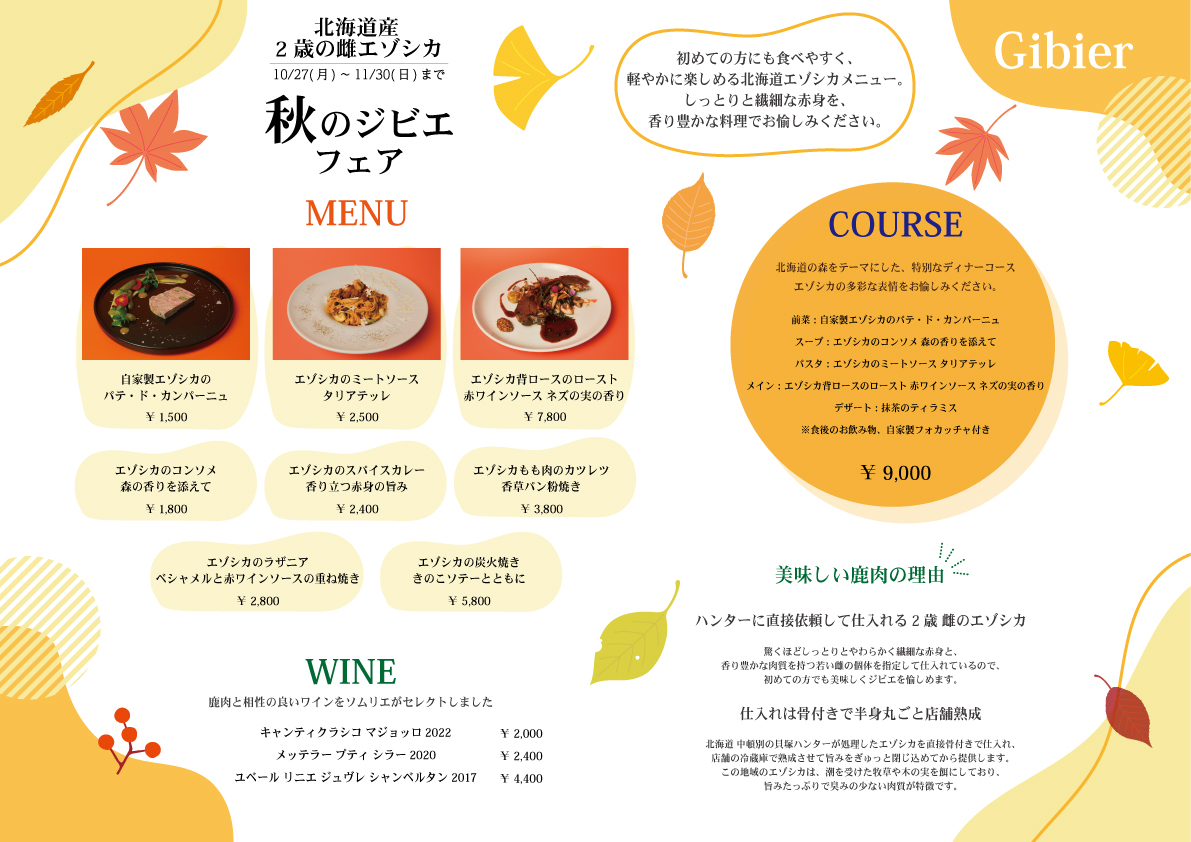 当店では、10月27日(月)より北海道産のエゾシカを使ったジビエメニューのフェアを開催致します。