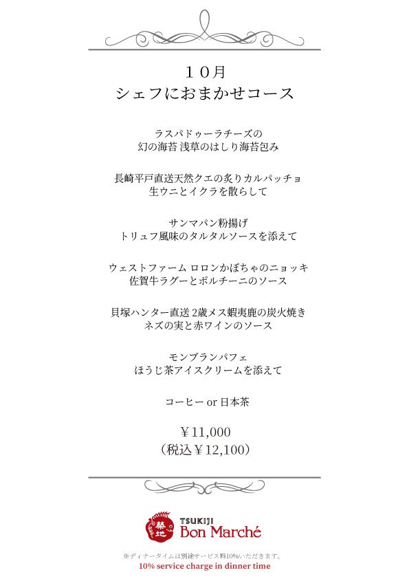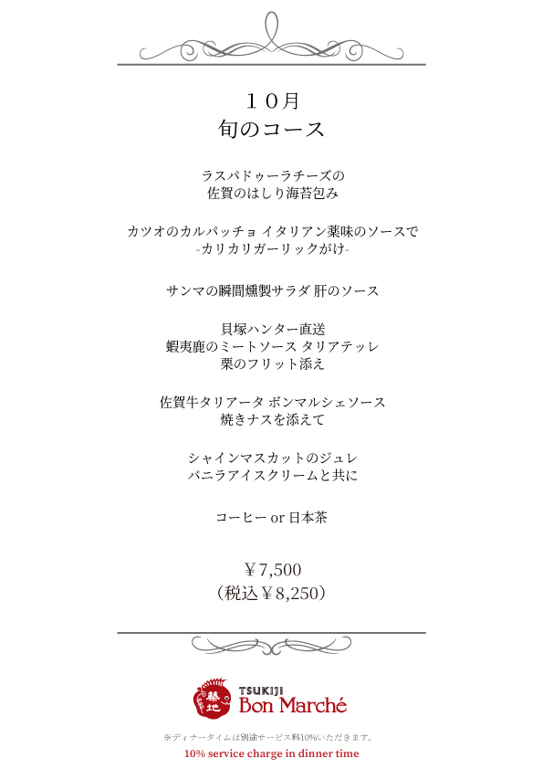 ニュースNews All メニュー&イベント メディア掲載 その他 10月ディナーコースメニューのご案内 2025.09.30 平素は築地ボン・マルシェをご利用頂き、ありがとうございます。 本日は10月のディナーコースメニューのお知らせです。 皆様のご来店をスタッフ一同心よりお待ちしております。 WEBでのご予約はコチラから または店舗まで直接お電話でお問合せください。 TEL03‐3541‐9341