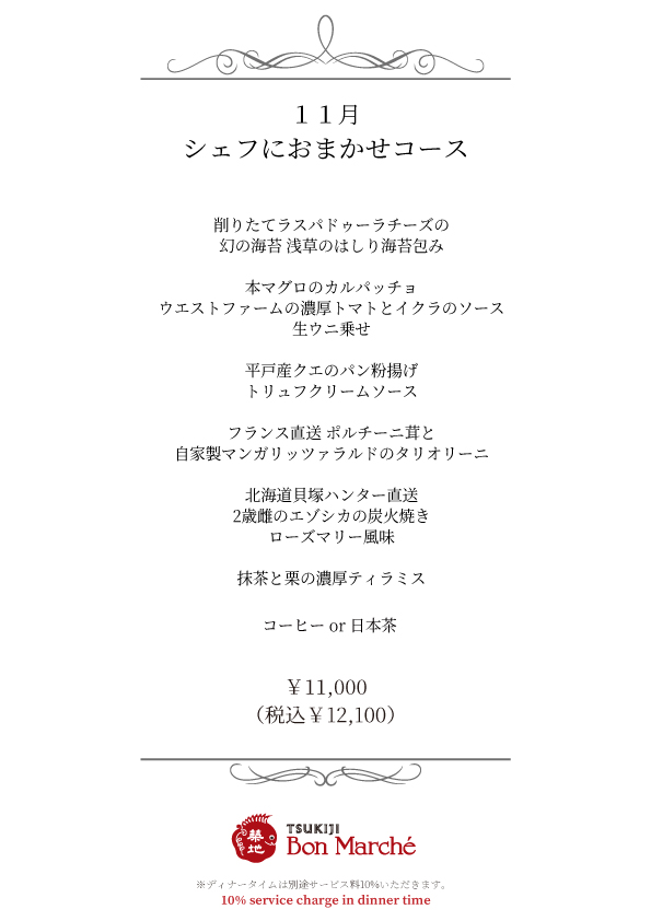 ニュースNews All メニュー&イベント メディア掲載 その他 11月ディナーコースメニューのご案内 2025.10.31 平素は築地ボン・マルシェをご利用頂き、ありがとうございます。 本日は11月のディナーコースメニューのお知らせです。 皆様のご来店をスタッフ一同心よりお待ちしております。 WEBでのご予約はコチラから または店舗まで直接お電話でお問合せください。 TEL03‐3541‐9341