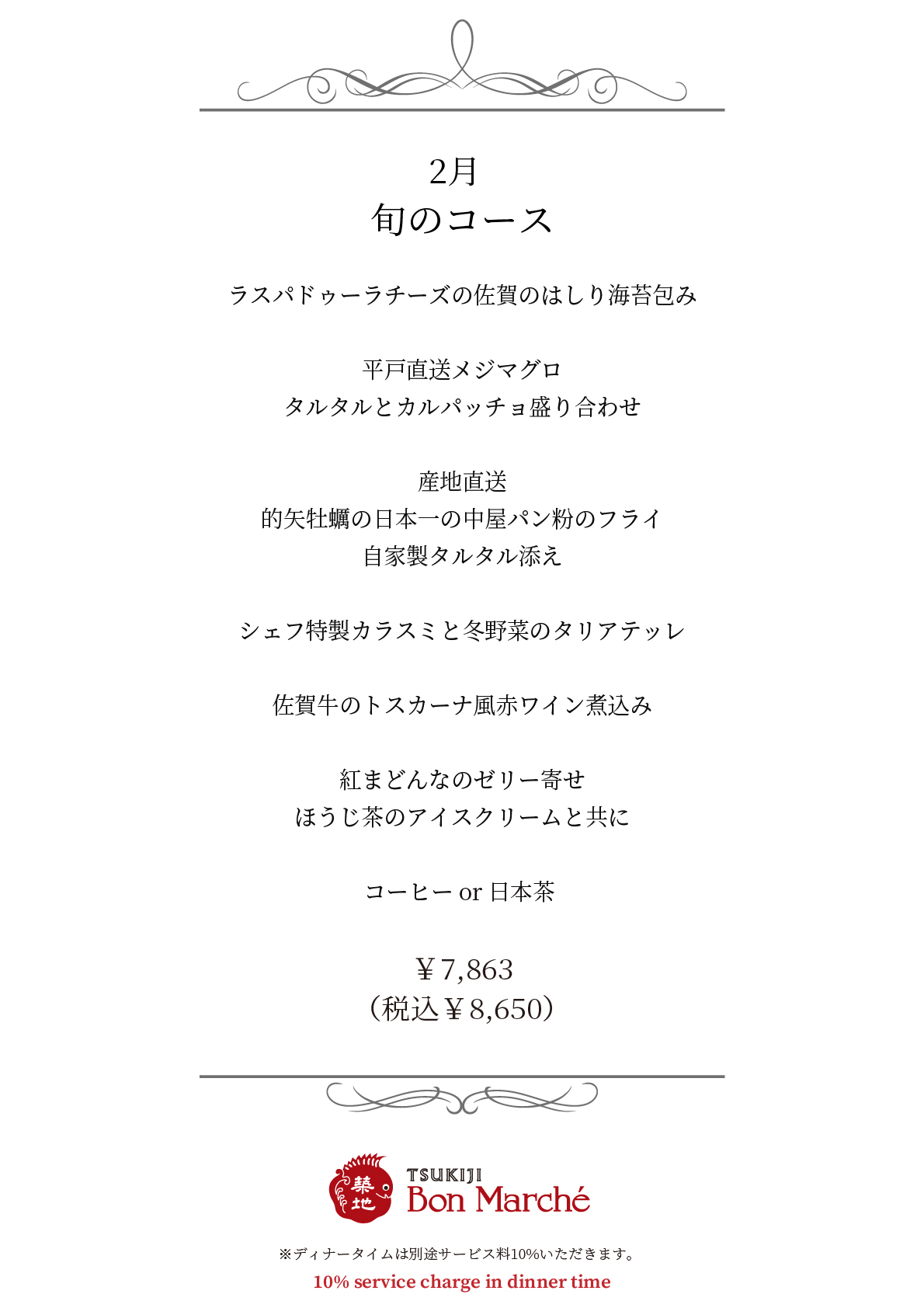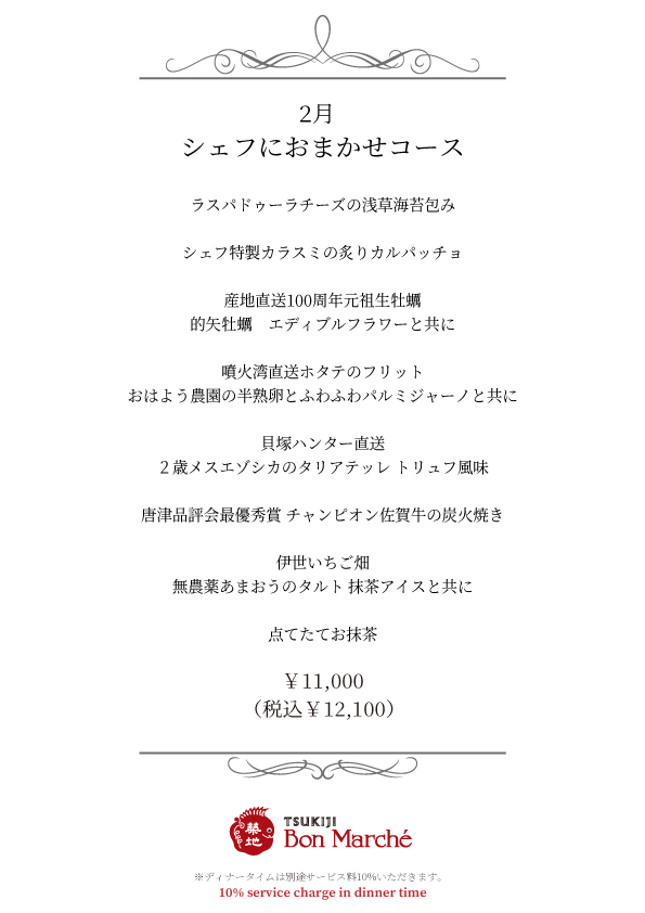 ニュースNews All メニュー&イベント メディア掲載 その他 2月ディナーコースメニューのご案内 2026.02.01 平素は築地ボン・マルシェをご利用頂き、ありがとうございます。 本日は2月のディナーコースメニューのお知らせです。 皆様のご来店をスタッフ一同心よりお待ちしております。 WEBでのご予約はコチラから または店舗まで直接お電話でお問合せください。 TEL03‐3541‐9341